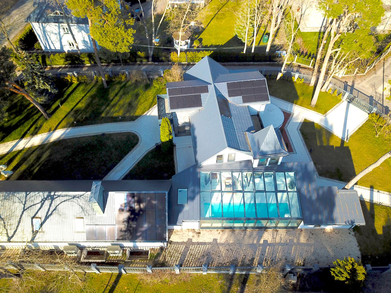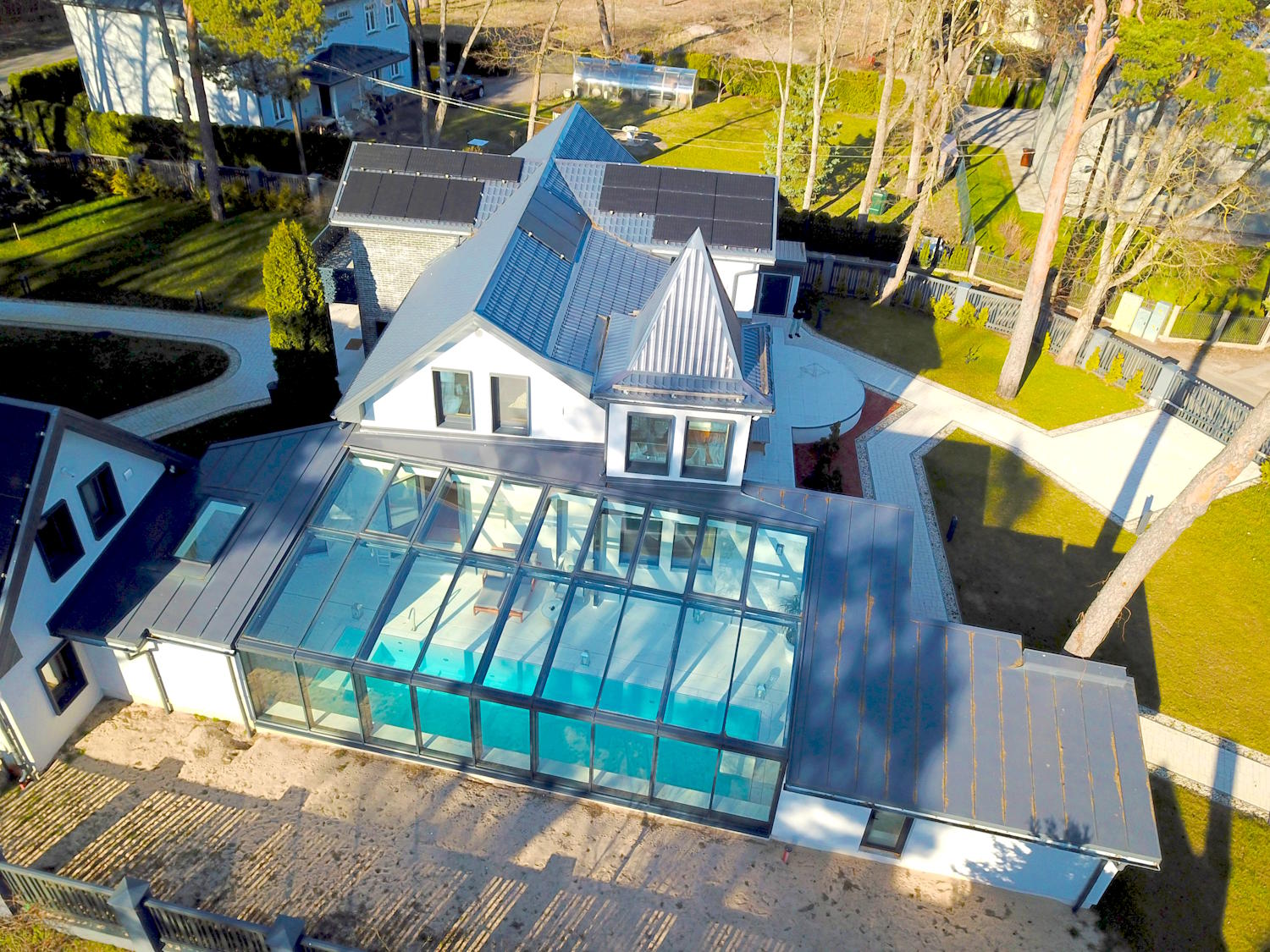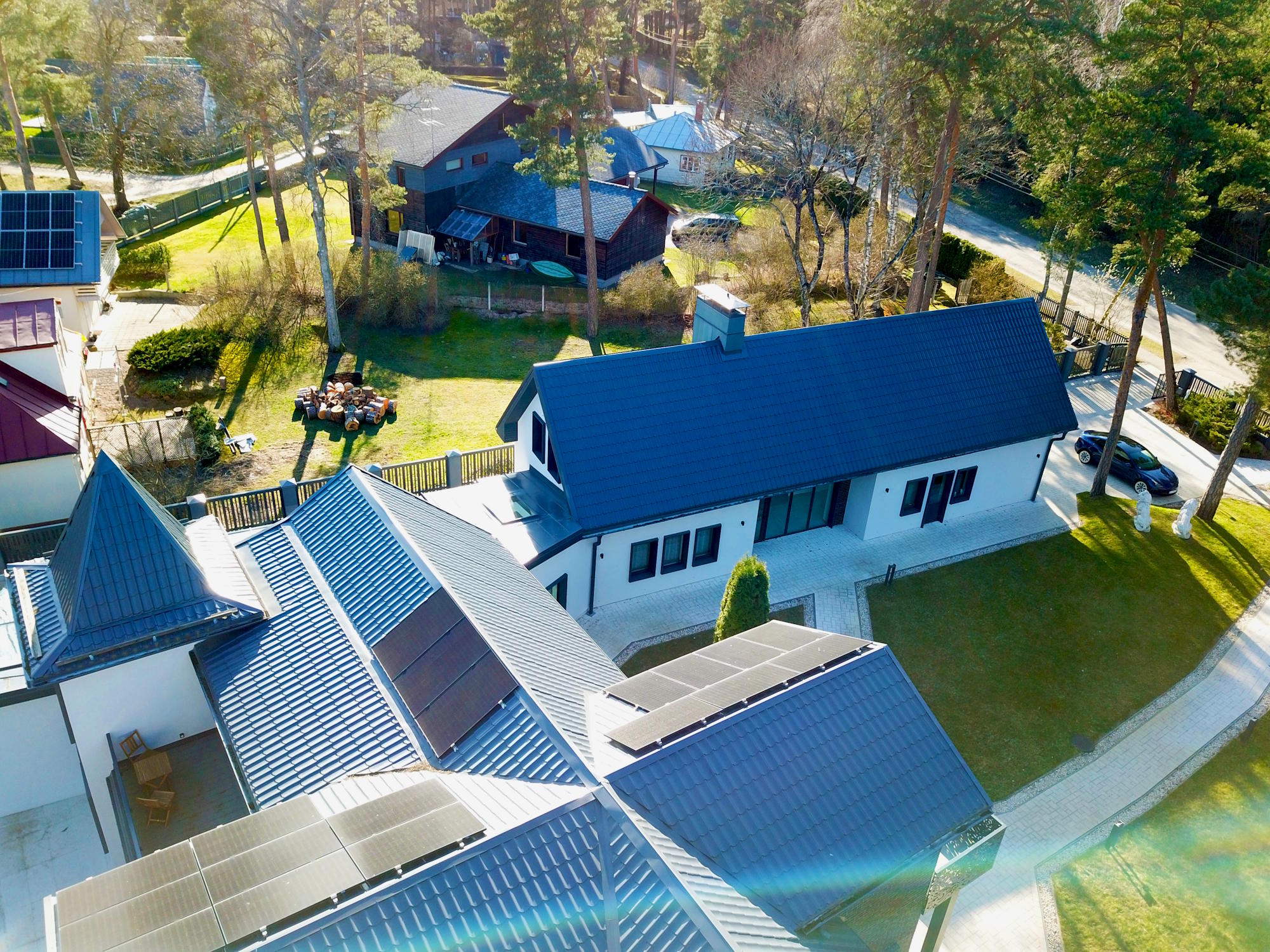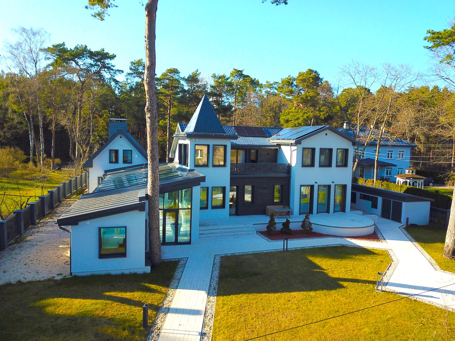 Solar panels, triple-glazed windows, underfloor heating, thick multi-layer walls that gives high energy efficiency level