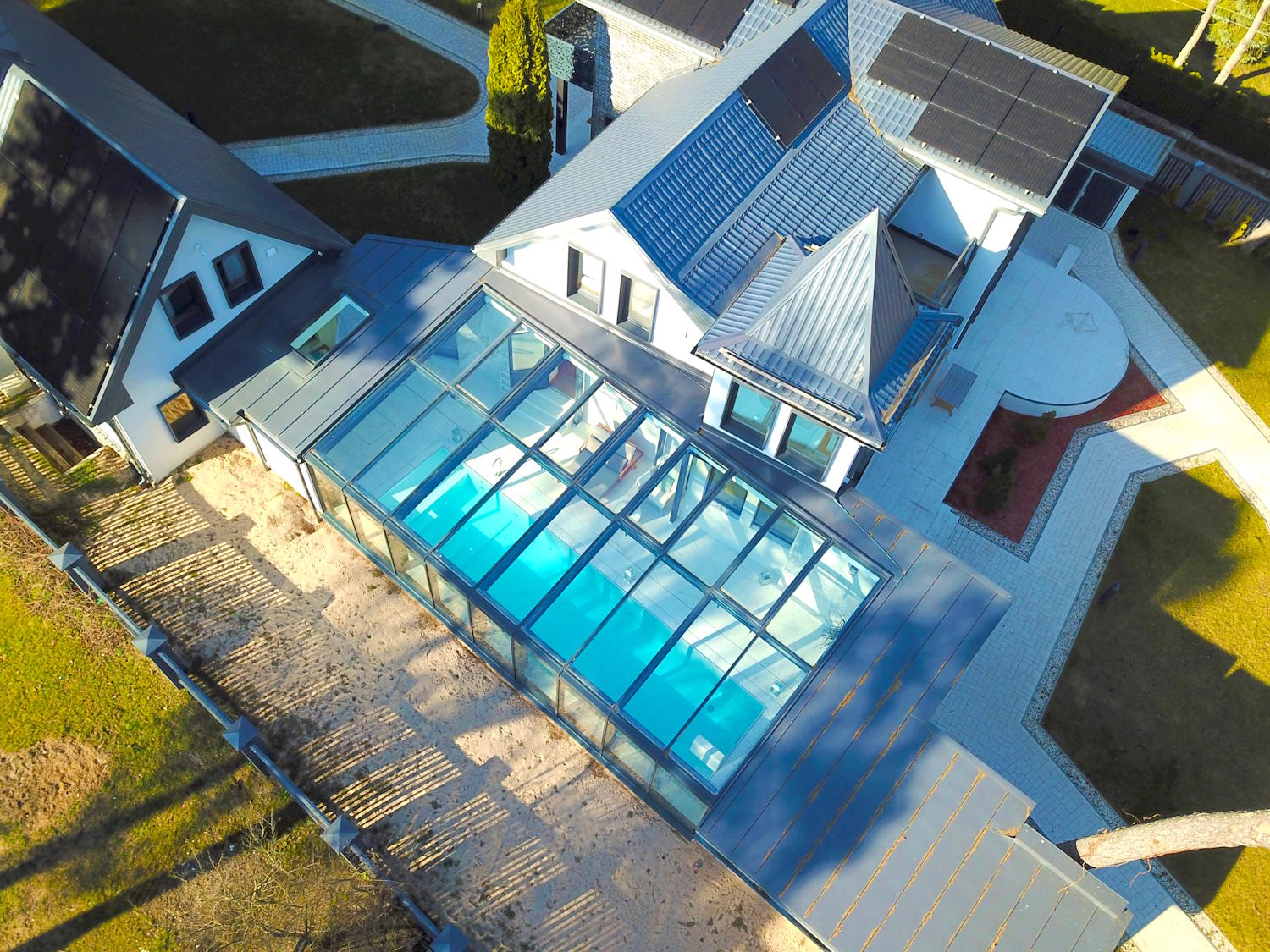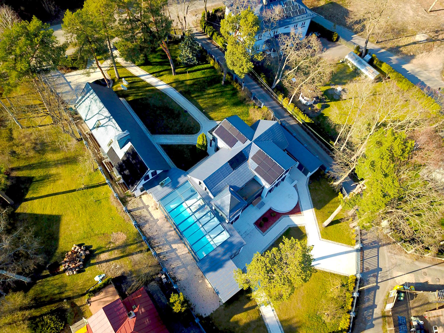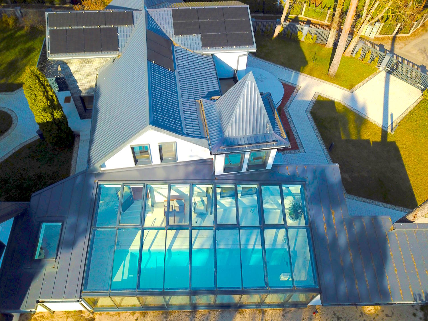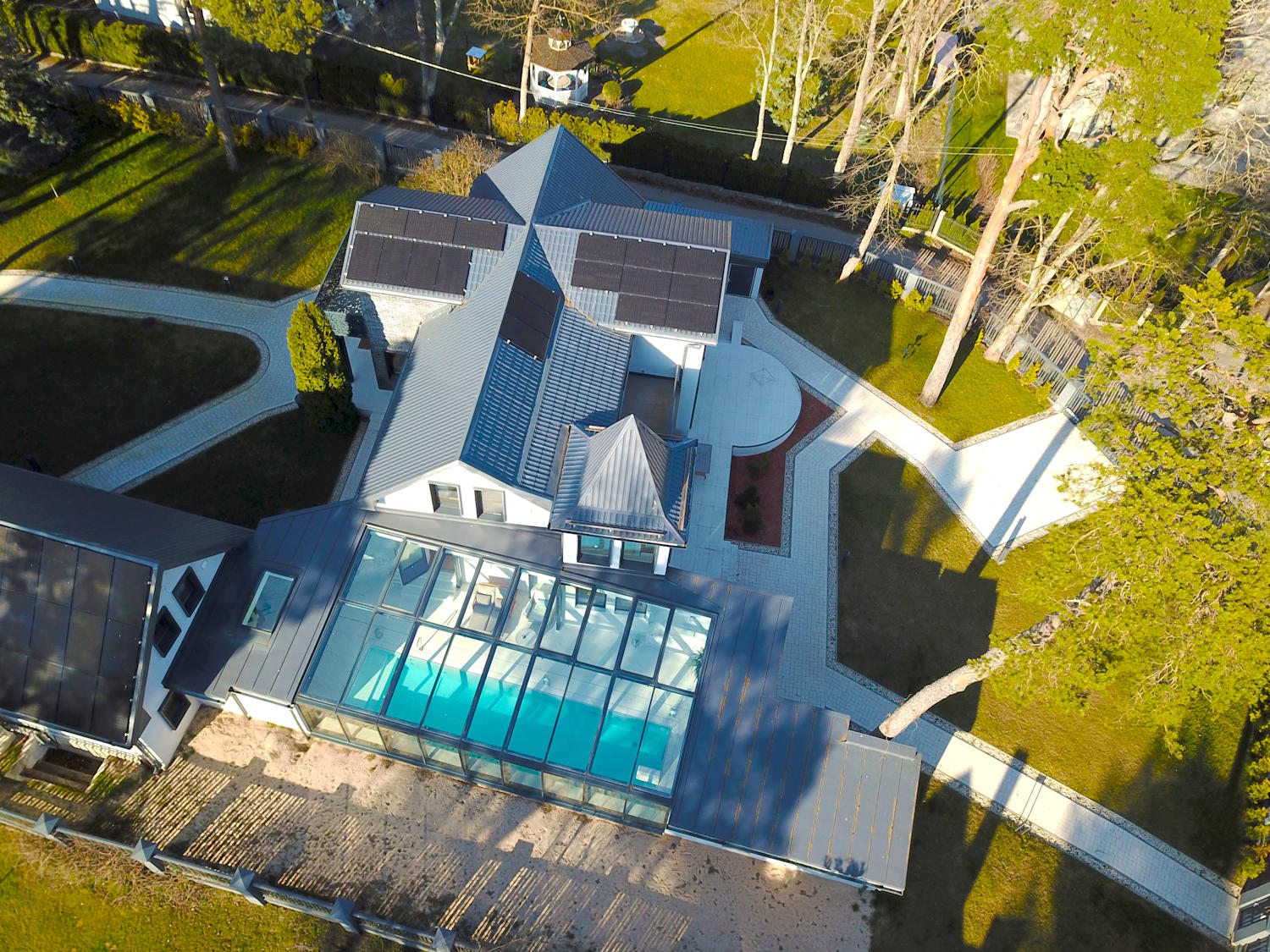 Solar panels, triple-glazed windows, underfloor heating, thick multi-layer walls that gives high energy efficiency level