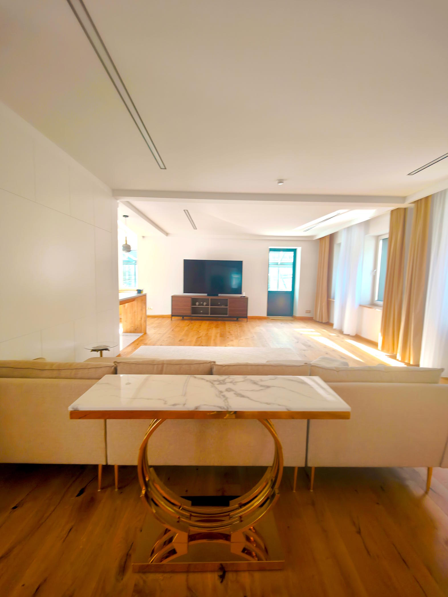 First floor: large living room that combines hall, living room, dining zone and fully-equipped kitchen as well. 84 inch 4K ultra TV with all smart TV features. Spacious bathroom with laundry equipment. Storage. Exit to the sunny side & river view terrace.