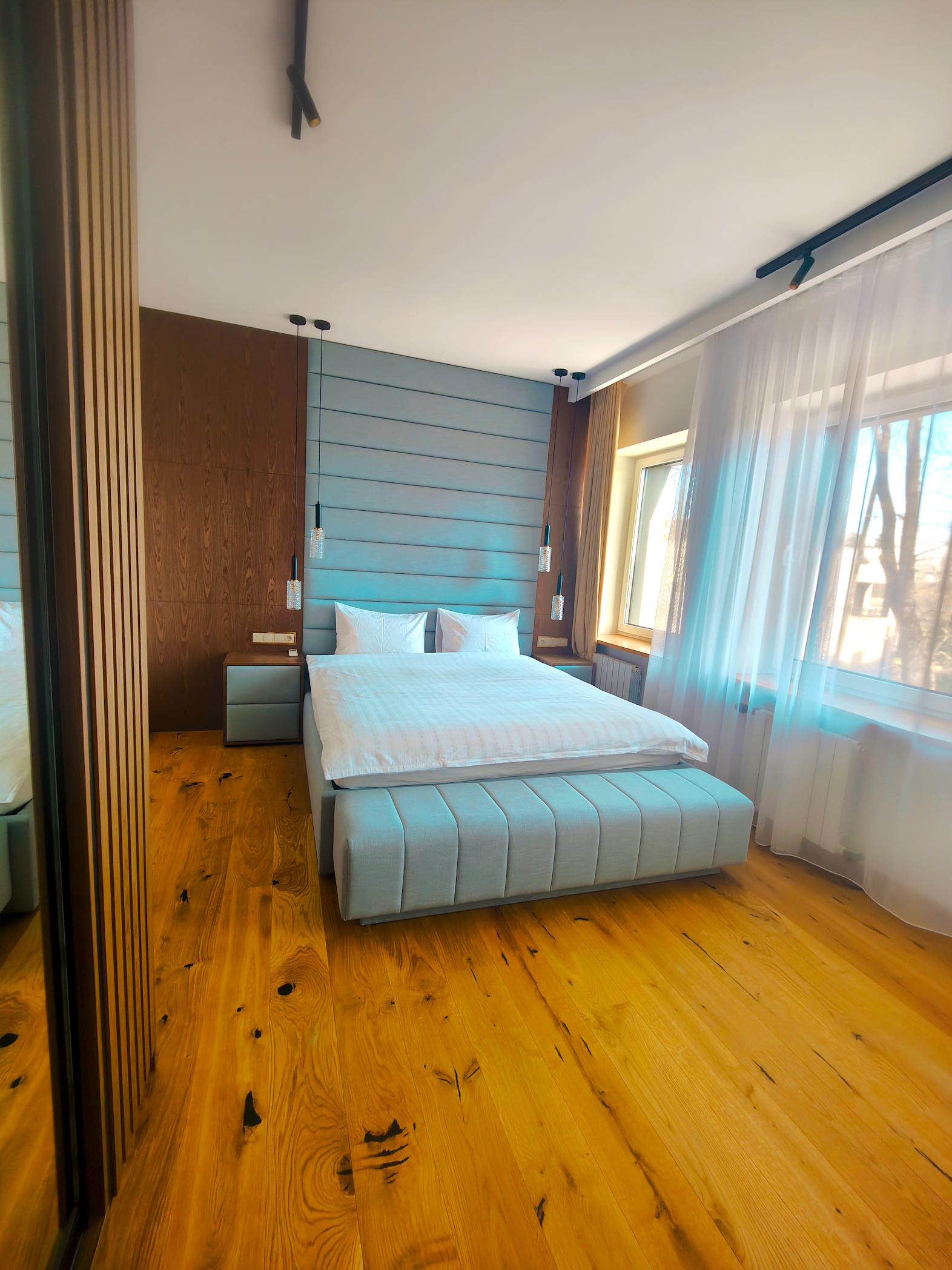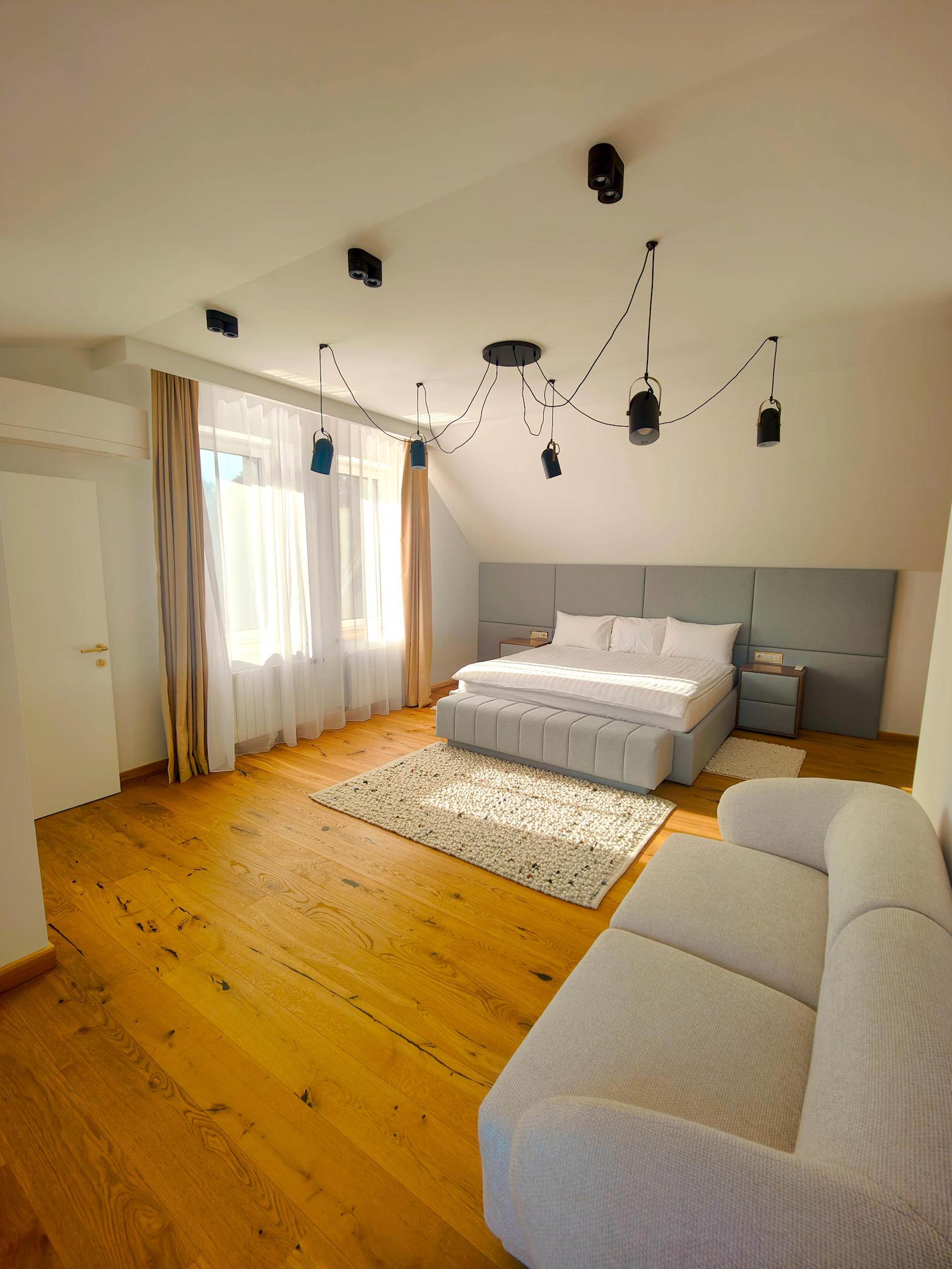 Spacious master bedroom with an extra sofa, build-in closet with led light sensors, king size bed, entrance to the sunny side balcony and en-suit bathroom with unique transparent bath, head shower and river view.
