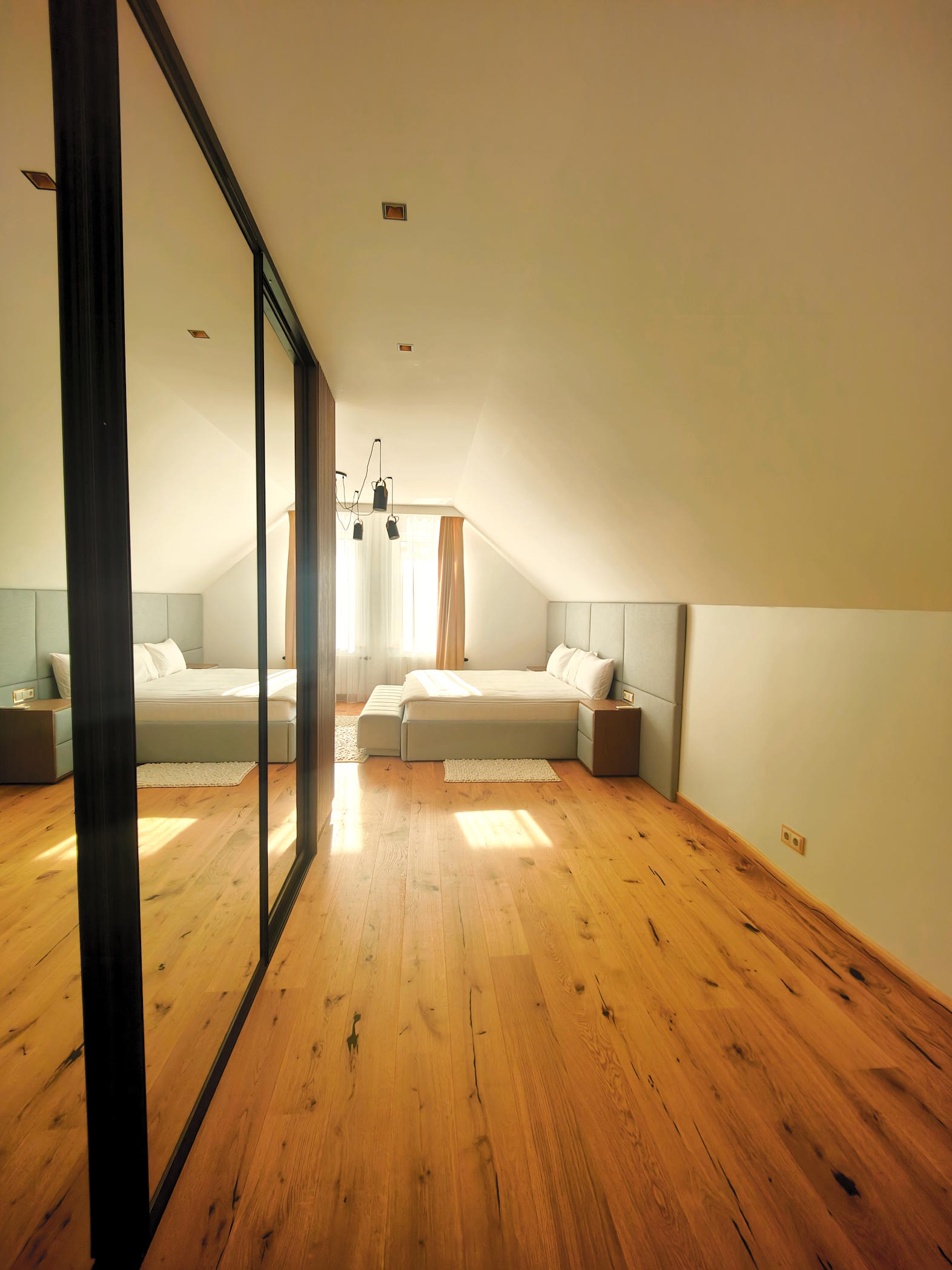 Second floor: staircase with an entrance on front-yard view balcony, cozy guest bedroom with double bed, build-in closet with led light sensors and view on the river.